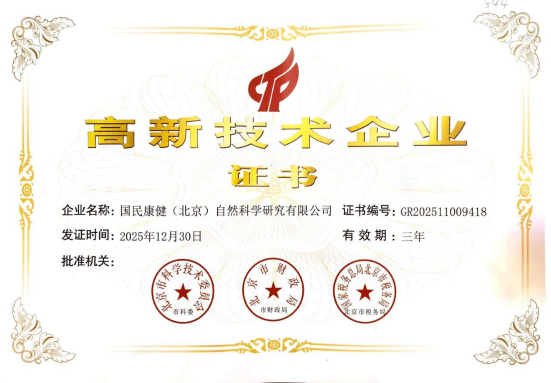 国民康健荣膺国家级高新技术企业:深耕硒产业,领航健康科技创新发表时间:2026-03-11 11:00 国民康健(北京)自然科学研究有限公司(以下简称“国民康健”)凭借其在硒产业领域的深厚积累与持续创新能力,于近期正式通过国家科技部、财政部、国家税务总局的联合评审认定,成功获评“国家高新技术企业”。这一国家级资质认证标志着国民康健在科技创新实力、核心技术研发及科技成果转化能力方面获得了权威认可,正式跻身国家高新技术企业行列。